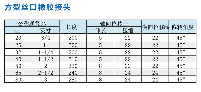 螺纹橡胶接头主要材质氯丁橡胶、天然橡胶和三元乙丙橡胶,丝扣橡胶接头耐天气自然变化可自动延伸。丝扣橡胶接头采 用网状钢丝进行多体保护。可防止该产品在长期使用中自然萎缩和减少老化破裂,可取代广泛应用于电厂、水厂、污水厂、 化工、冶金行业的其它伸缩产品,另外一点非常重要就是橡胶软接头是绿色环保产品,使用该产品对人类没有污染,没有 任何副作用。